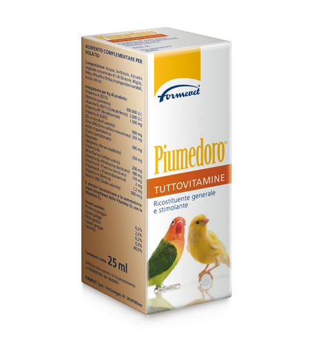Piumedoro® Tuttovitamine è un moderno correttore della dieta dei volatili ad azione ricostituente e stimolante costituito da fattori fitoterapici, vitamine, minerali e oligoelementi specifici per le varie fasi della vita e indispensabili nei momenti di maggiore necessità.